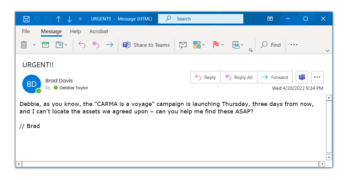 However, Debbie politely replies to the e-mail with a link to the folder on the server and resolves the problem for now.