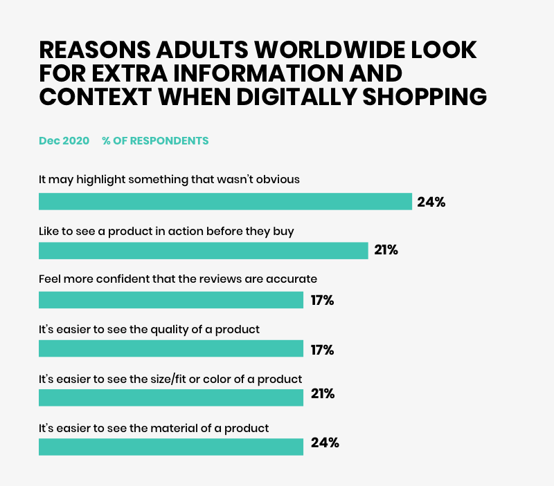 A December 2020 Savanta survey quoted in an eMarketer article found that 62% of respondents said they were more likely to buy a product if they could view photos and videos from other customers. 21% said they would like to see the product “in action” before making a high-value purchase.
