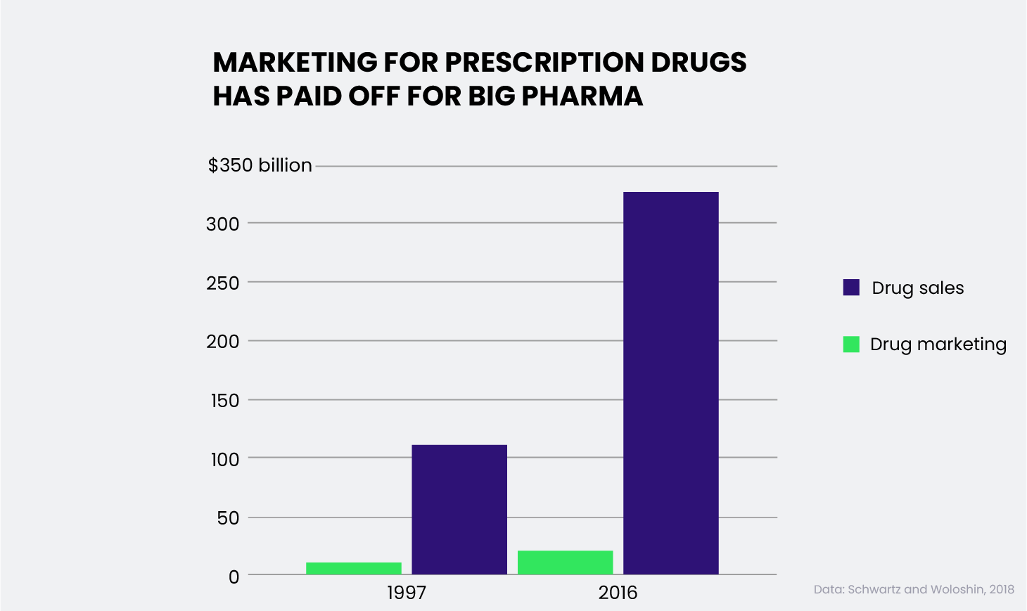 In fact, big pharma companies increased their spending by $10 billion on marketing between 1997 and 2016, leading to an increase in drug sales from from $116.4 billion to $329 billion.